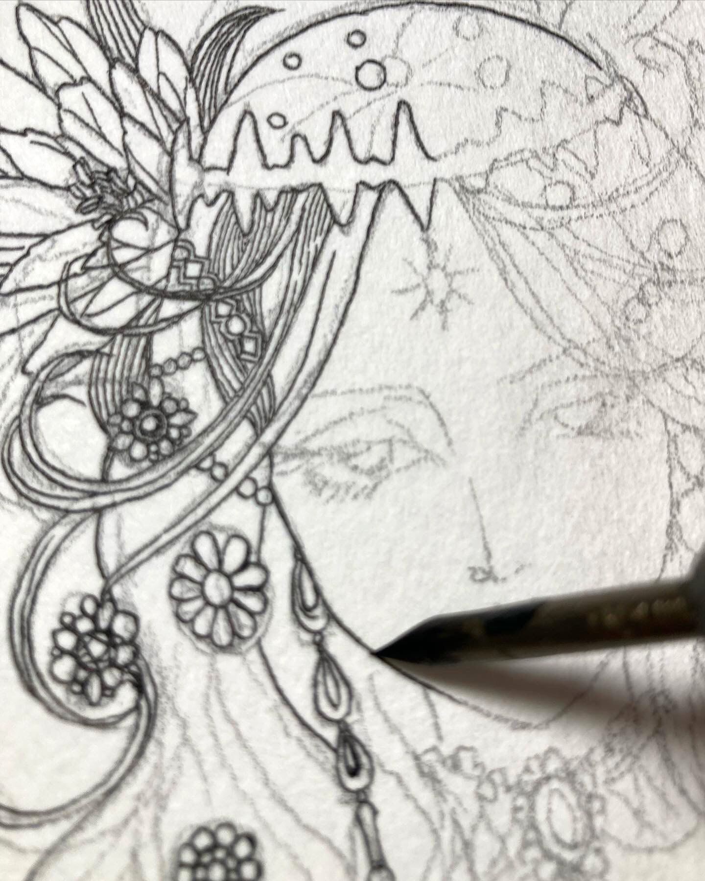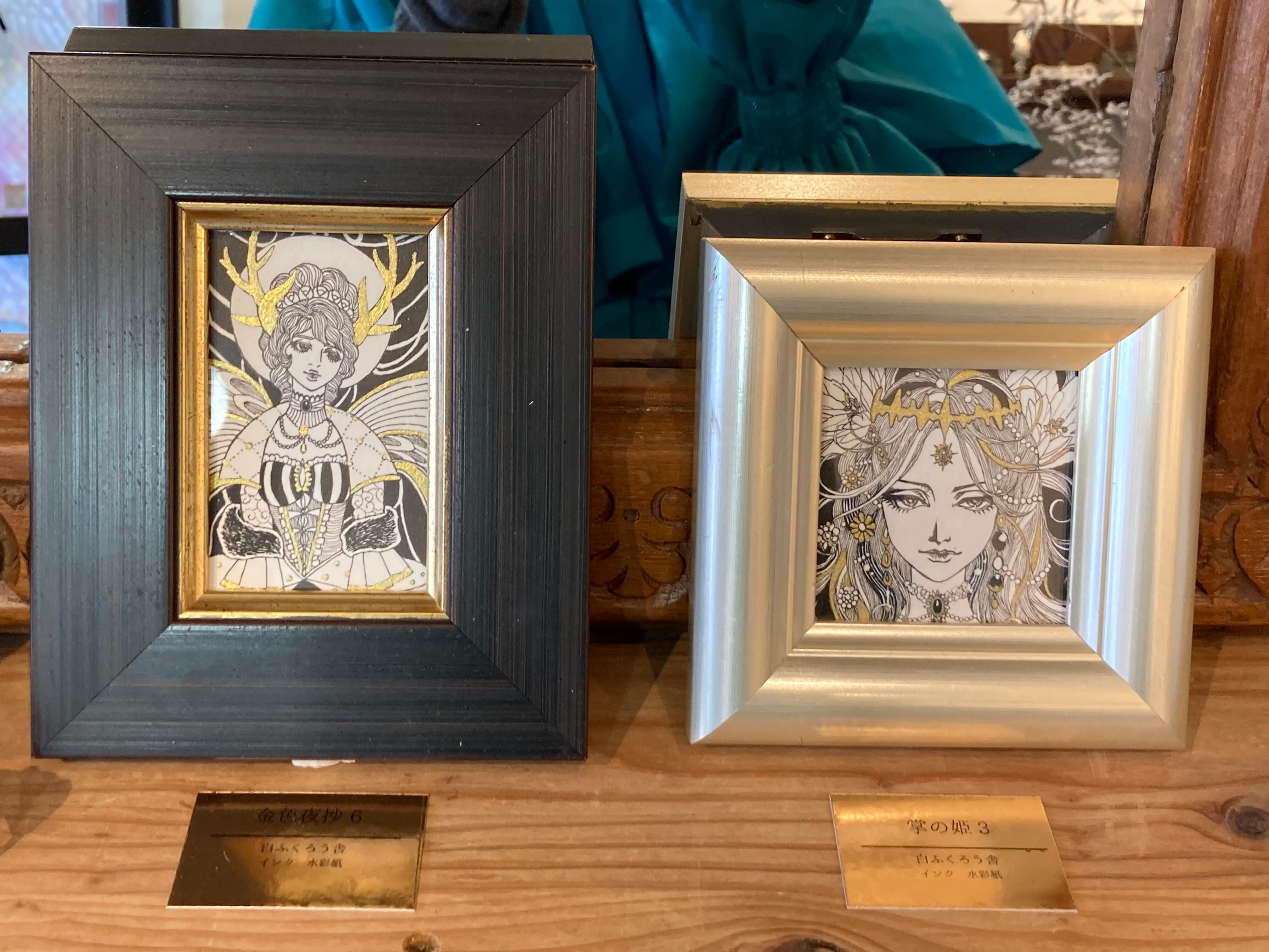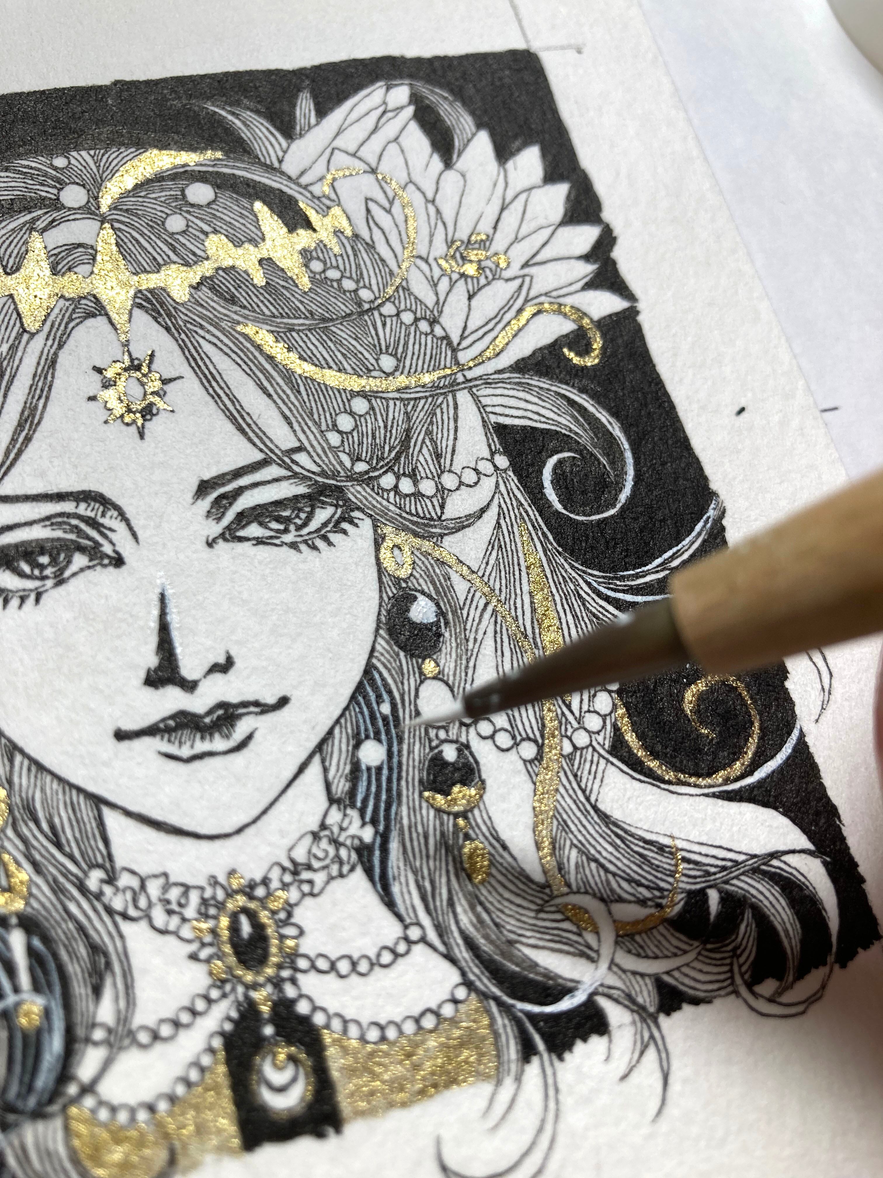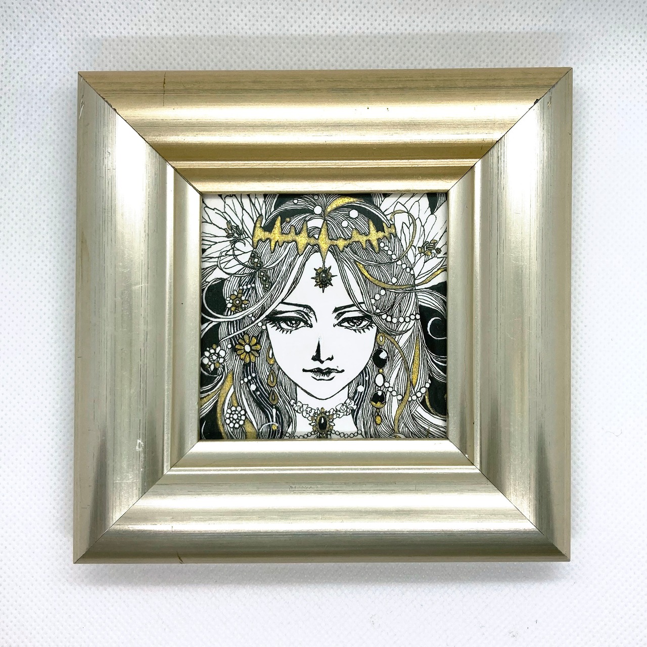 墨と金の着彩が施された、繊細で美しい手描きドローイング。美しく小さな額縁に入ったアート作品です。緻密な描写と独自の世界観を身近でお楽しみいただけます。