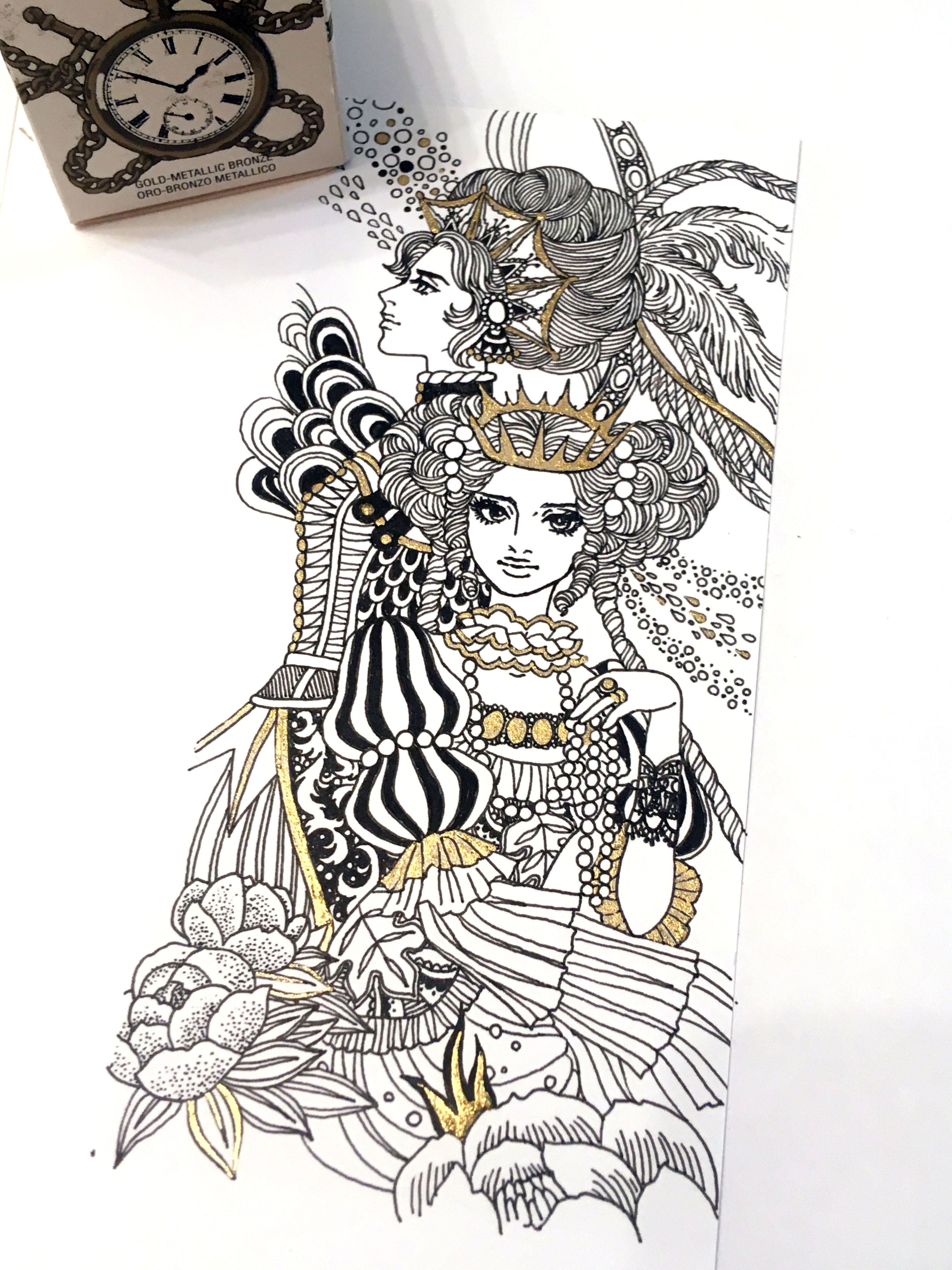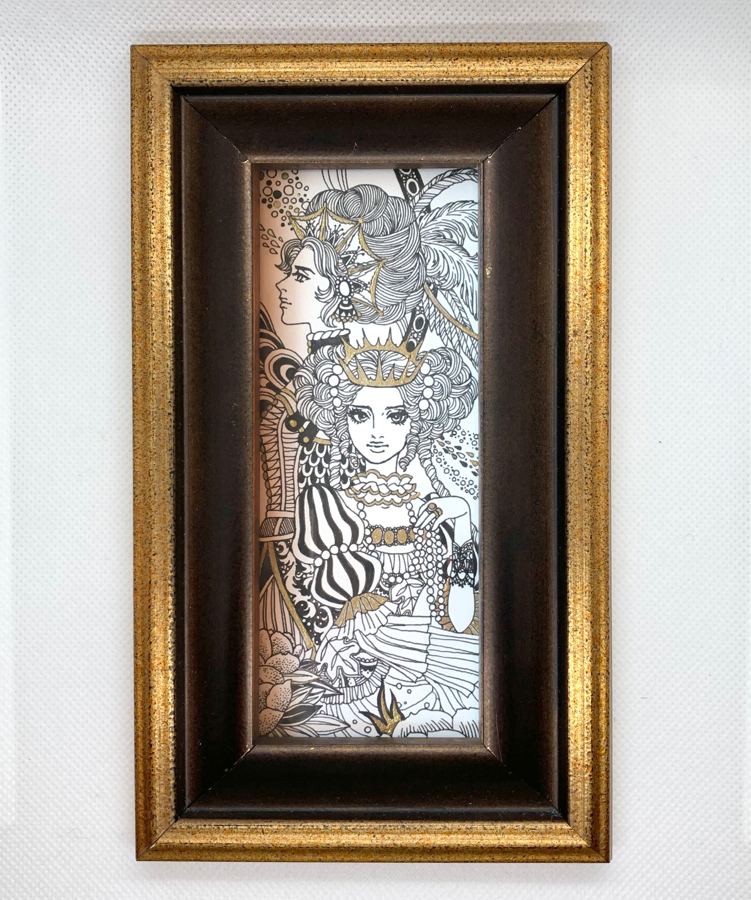 墨と金の着彩が施された、繊細で美しい手描きドローイング。美しく小さな額縁に入ったアート作品です。緻密な描写と独自の世界観を身近でお楽しみいただけます。