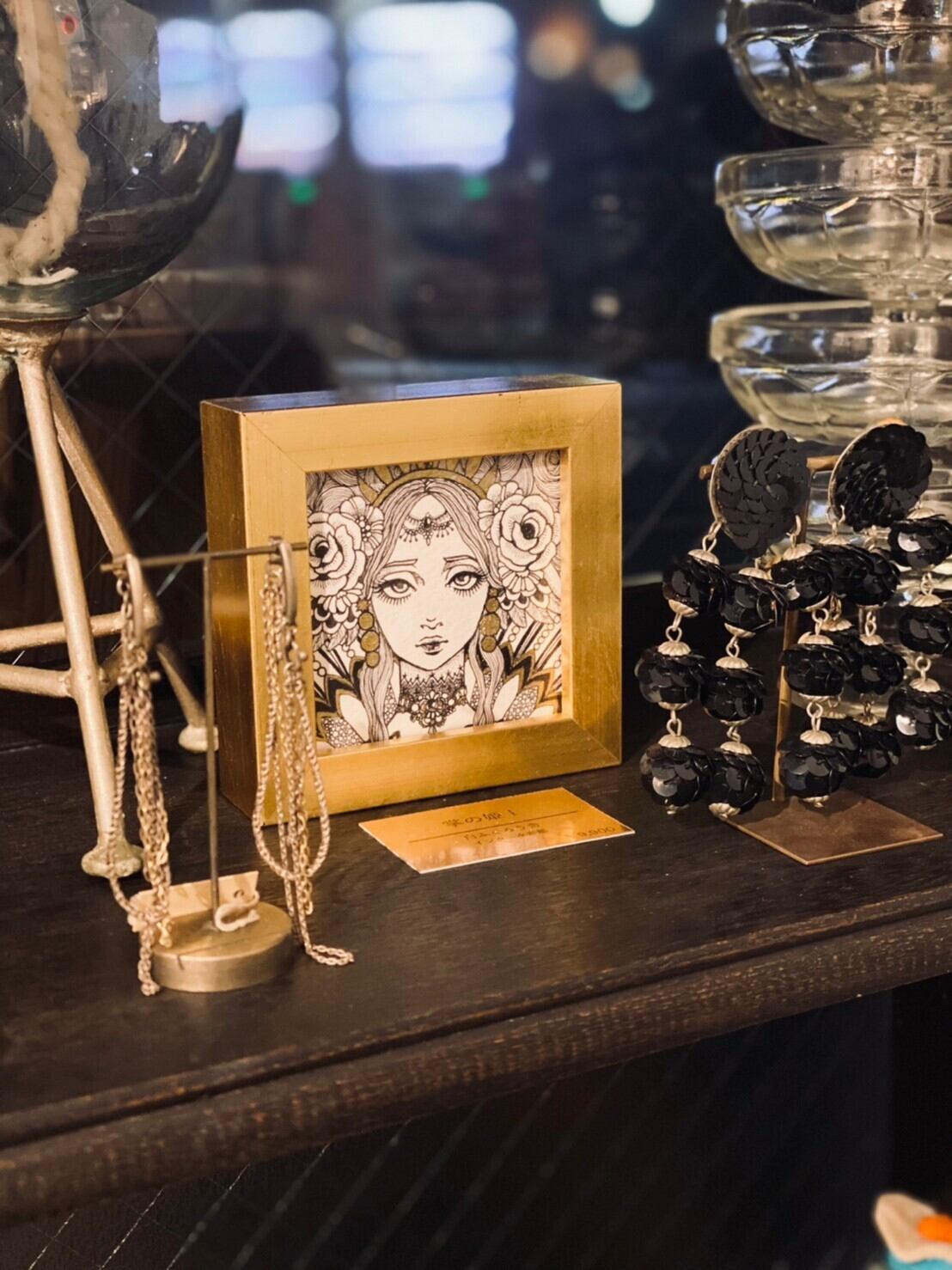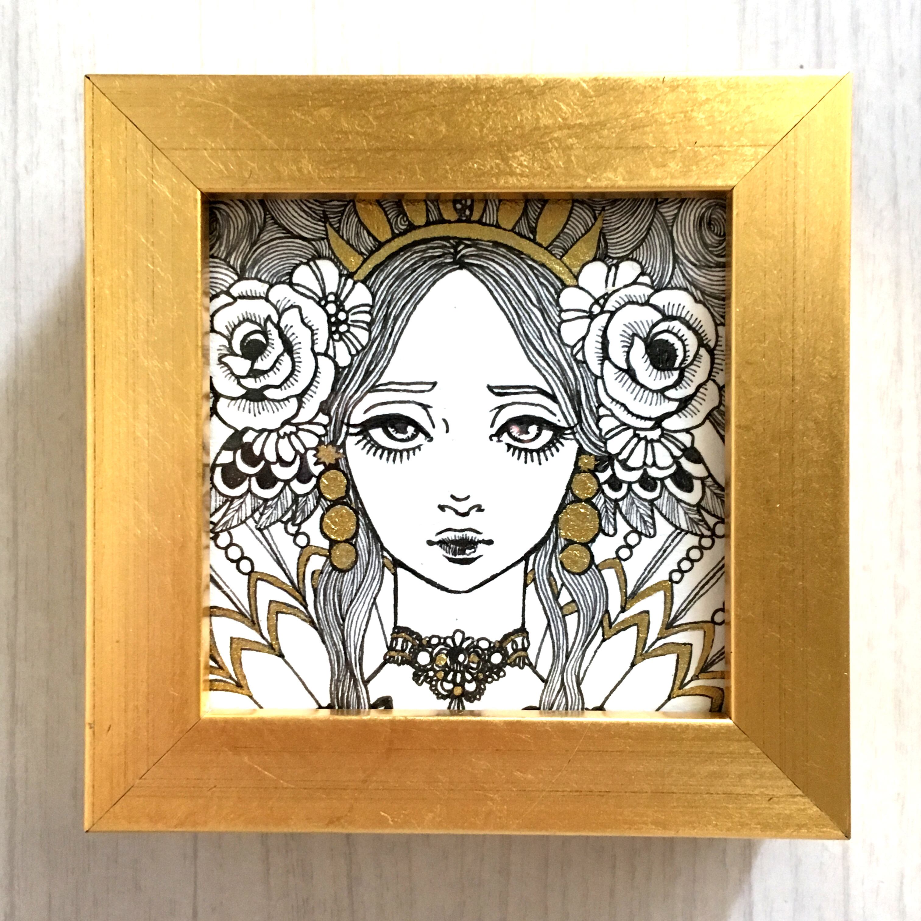 墨と金の着彩が施された、繊細で美しい手描きドローイング。美しく小さな額縁に入ったアート作品です。緻密な描写と独自の世界観を身近でお楽しみいただけます。